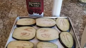 Arrange sliced eggplant in a single layer onto two paper towel lined baking sheet pans. Sprinkle liberally with kosher salt (It adheres best to the eggplant) on both sides, cover with more paper towel. Let sit for 30 minutes. Rinse and pat dry.